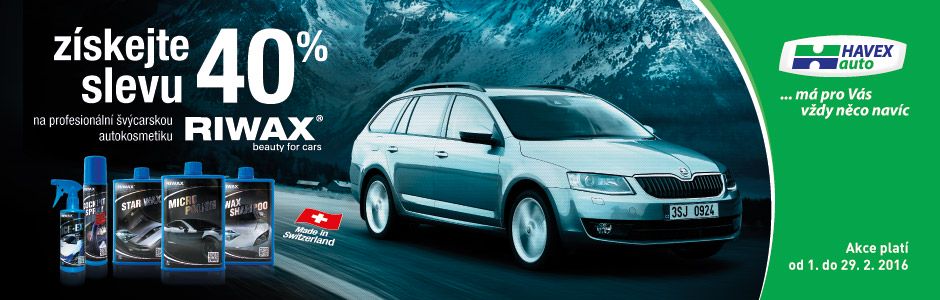 Pořiďte si u nás v únoru nové či ojeté auto, přijďte na servis nebo nakupte originální náhradní díly a příslušenství, a obdržíte od nás jako odměnu slevu 30 % na zimní sortiment a 40 % slevu na ostatní produkty společnosti RIWAX na www.autokosmetika-riwax.cz/eshop/.