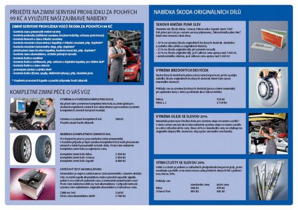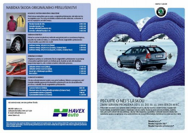 … Zima si v letošním roce opravdu velmi pospíšila a proto je nejvyšší čas připravit i váš vůz na nadcházející zimní období. V servisech HAVEX-auto jsme připraveni za pouhých 99,-Kč prohlédnout a zkontrolovat i váš vůz. Naši technici vám případně doporučí nejvhodnější opravu nebo nabídnou originální příslušenství Škoda za výhodné akční ceny.