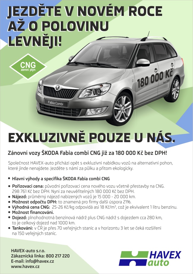 Zvažujete koupi nového vozu a rádi byste jezdili levně a ekologicky? Právě pro Vás máme exkluzivně nyní nabídku zánovních vozů Škoda Fabia combi CNG již za cenu 180 000 Kč bez DPH.