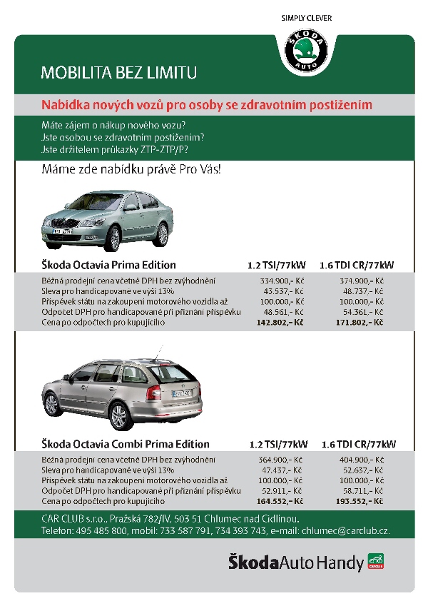 držitele průkazů ZTP a ZTP/P jsme připravili přehled konečných cen jednotlivých modelů po započtení všech zvýhodnění. Více informací o akci ZDE, kontakt na prodejce vozů HANDY najdete ZDE.