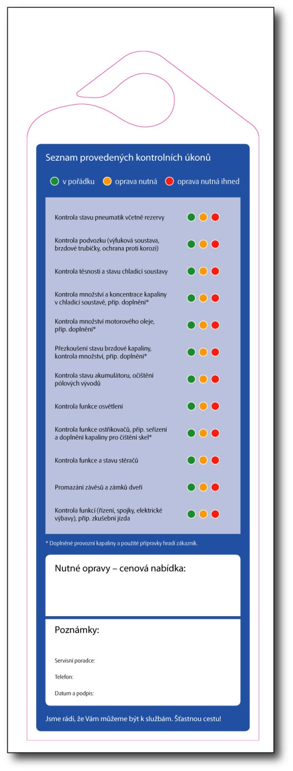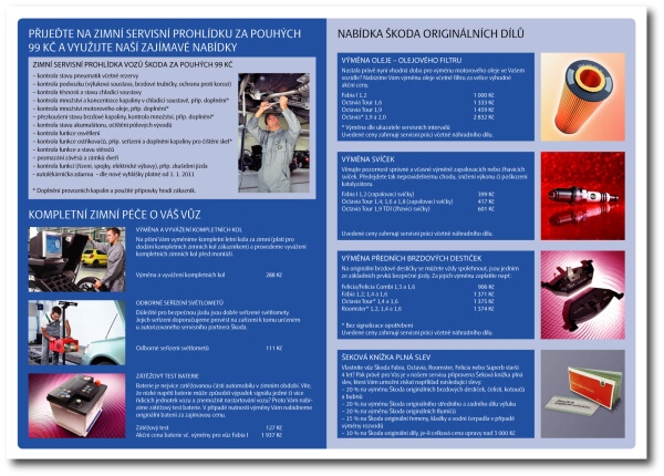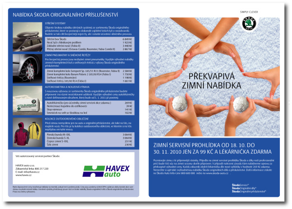mohli s prvními mrazy na svůj vůz vždy spolehnout a letos máme pro Vás i něco takříkajíc navíc. S příchodem nového roku nastane povinnost mít ve voze lékárničku podle nové platné vyhlášky č.216/2010. Chcete-li tedy spojit příjemné s užitečným neváhejte a kontaktujte naše autorizované servisy objednejte se za 99,-Kč na Zimní servisní akci a jako dárek od nás obdržíte novou lékárničku. Navíc, pokud nalezneme na voze závadu, nabídneme Vám opravu za překvapivě výhodné ceny. Nyní záleží již na jen Vás. Nabídka od HAVEX-auto je to bezsporu zajímavá, proto nenenchávejte přípravu svého vozu před nastávající zimou i povinnost mít ve voze novou lékárničku na poslední chvíli. Také policie se nechala slyšet, že bude nekompromisní od prvních lednových dnů. Tešíme se na Vás v našich autorizovaných pobočkách v Mladé Boleslavi, Vrchlabí, Nové Pace, Semilech a Chlumci nad Cidlinou. Akce končí končí 30.11.2010. Mnoho štastných zimních kilometrů s připraveným vozem Vám přeje HAVEX-auto. Stáhněte si leták Zimní servisní akce.