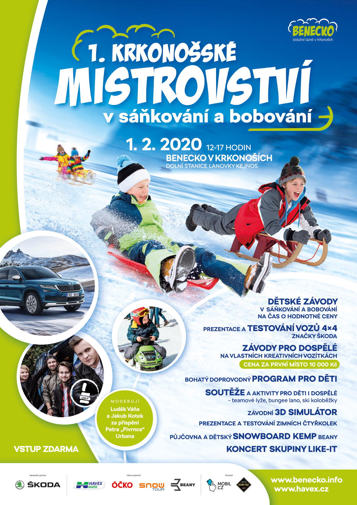rádi bychom vás tímto pozvali na další skvělou akci, plnou zábavných aktivit a zážítků. Navoskujte boby, nabruste hrany sáněk, oprašte zimní kombinézy, vezměte své ratolesti, přátelé a známé a vyrazte na 1. krkonošské mistrovství v sáňkování a bobování, které se bude konat 1. 2. 2020 od 12:00 hodin na Benecku v Krkonoších, ve spodní části lanovky Kejnos. Těšit se můžete na závody dětí všech věkových kategorií, bohatý doprovodný program, kde si na své přijdou jak rodiče, tak děti. Budou soutěže, adrenalin, zábava, muzika, tanec, i ohňostroj bude… Díky partnerům Benecko, generálnímu partnerovi Škoda AUTO, snow tour hudební stanice Óčko, HAVEX-auto, BEANY, Enjoy catering se podařilo připravit vskutku super den pro rodiny, kde si na konci akce odnesete jak spokojený úsměv na rtech, zajímavé zážitky, tak i zajímavé ceny ze soutěží. Nikdo neodjede s prázdnou…